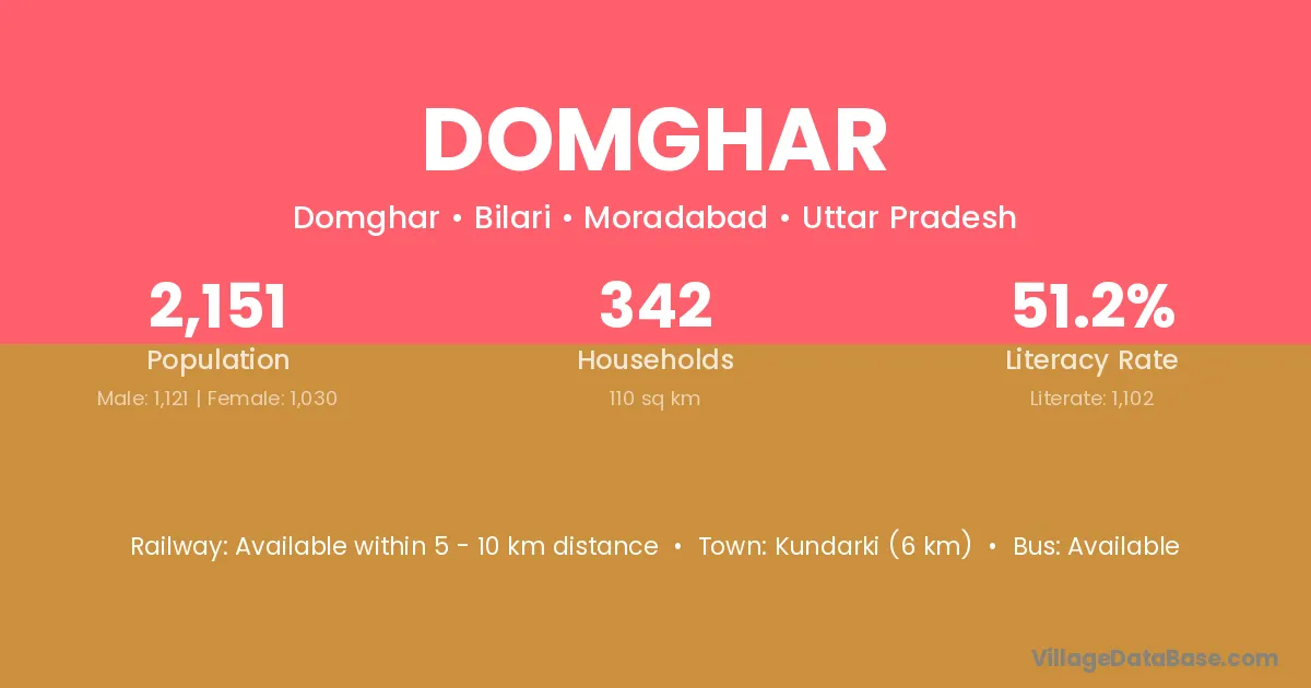Domghar village has a total population of 2,151 people, of which 1,121 are males and 1,030 are females.