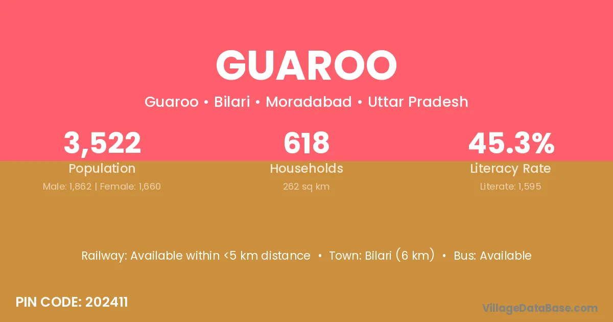 Guaroo village is located in the Bilari Tehsil of the Moradabad district in Uttar Pradesh .