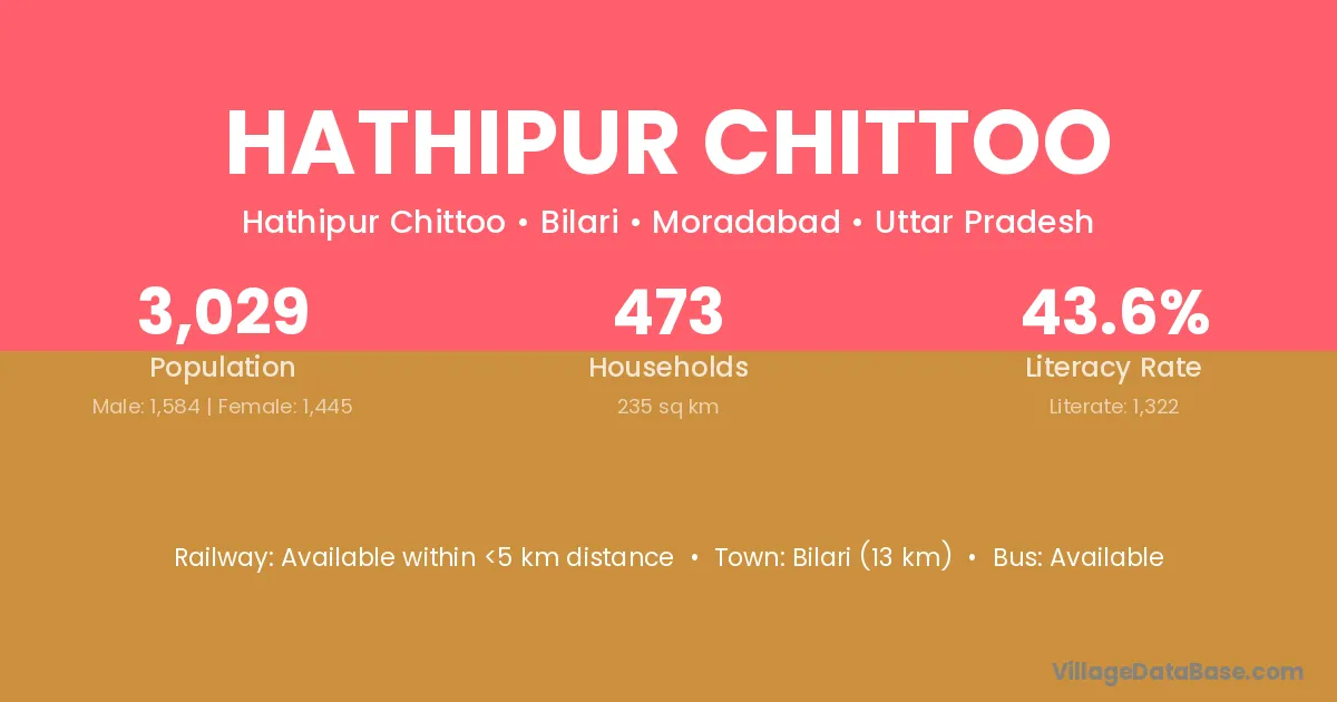Bilari (13 km) is the nearest town to Hathipur Chittoo village for major economic activities and is located approximately 13 km away.