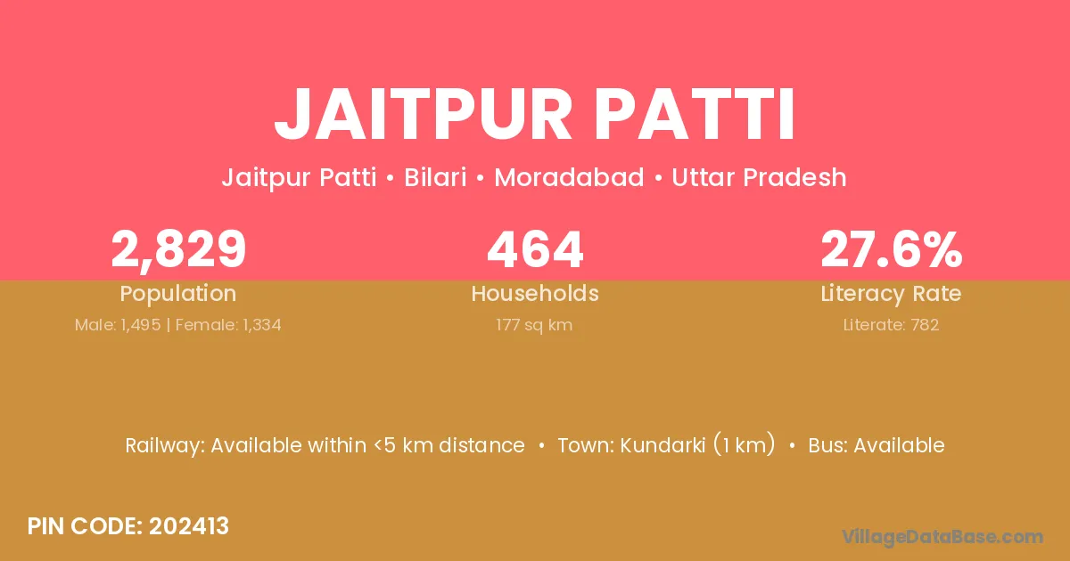 Kundarki (1 km) is the nearest town to Jaitpur Patti village for major economic activities and is located approximately 1 km away.