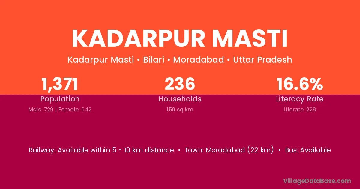 Moradabad (22 km) is the nearest town to Kadarpur Masti village for major economic activities and is located approximately 22 km away.