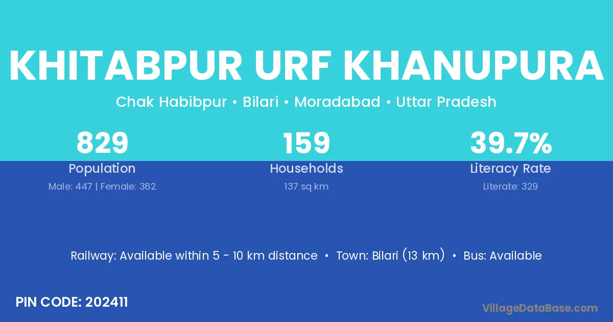 Bilari (13 km) is the nearest town to Khitabpur Urf Khanupura village for major economic activities and is located approximately 13 km away.