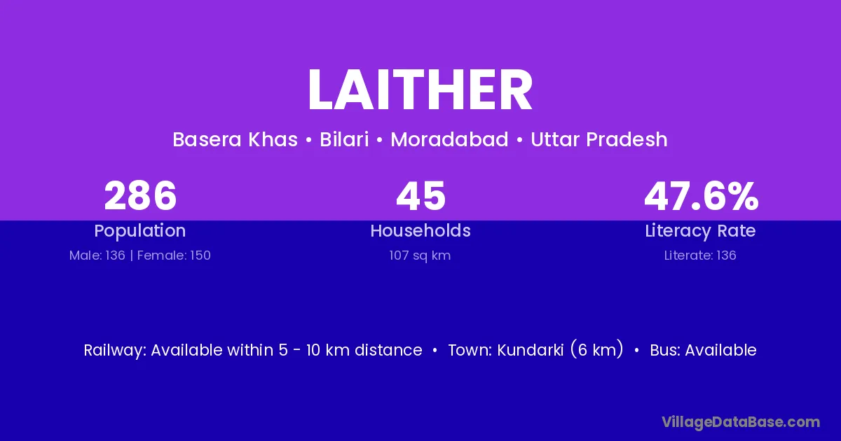 Kundarki (6 km) is the nearest town to Laither village for major economic activities and is located approximately 6 km away.