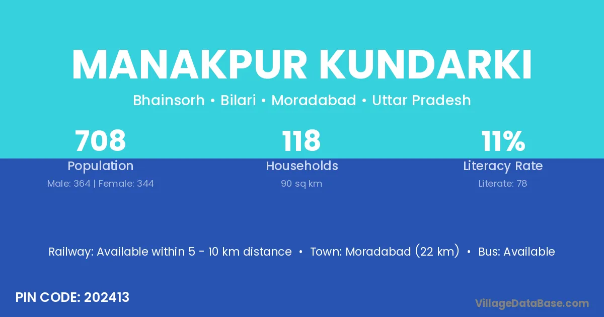 Moradabad (22 km) is the nearest town to Manakpur Kundarki village for major economic activities and is located approximately 22 km away.
