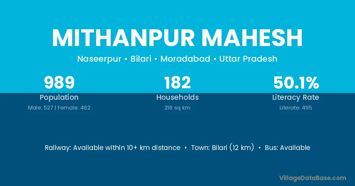 Bilari (12 km) is the nearest town to Mithanpur Mahesh village for major economic activities and is located approximately 12 km away.