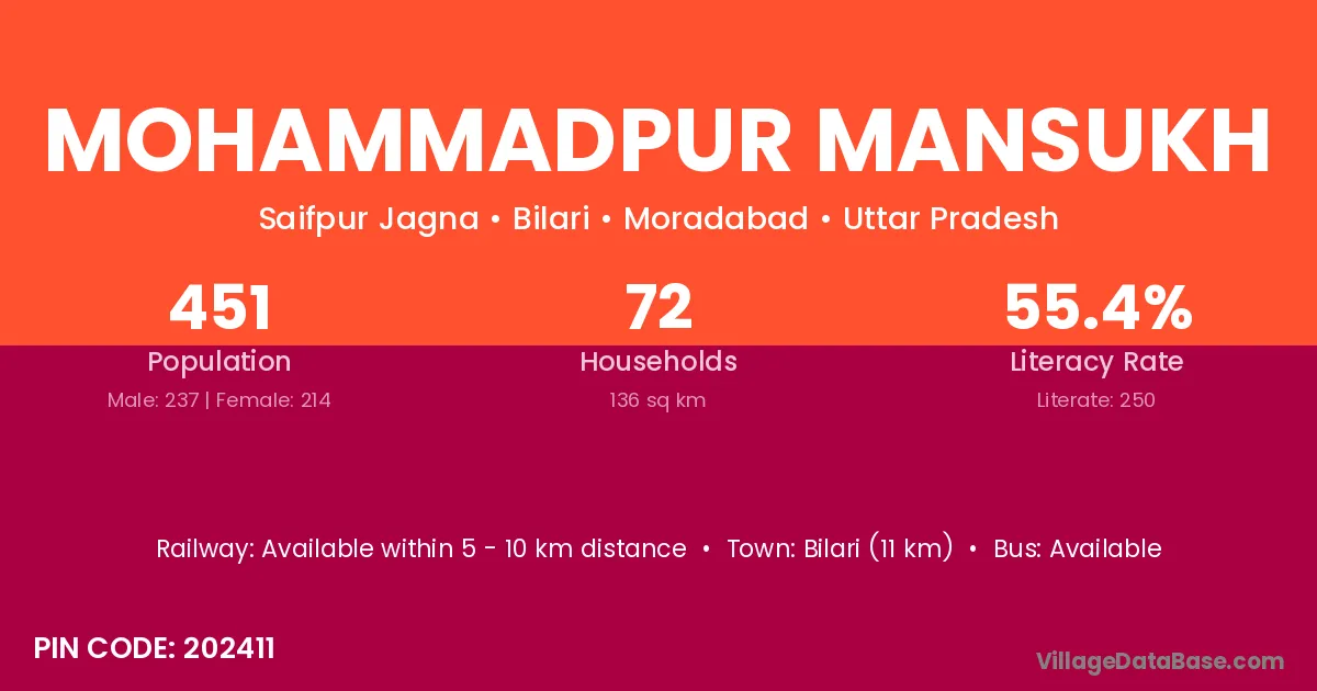 Bilari (11 km) is the nearest town to Mohammadpur Mansukh village for major economic activities and is located approximately 11 km away.