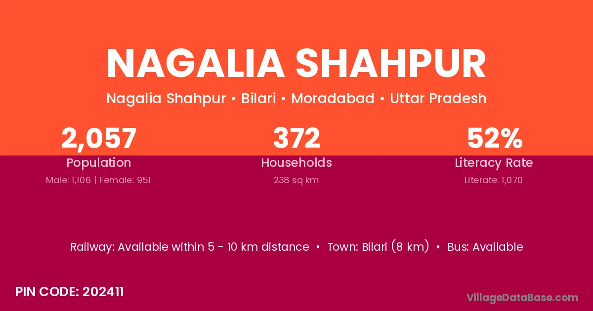 Bilari (8 km) is the nearest town to Nagalia Shahpur village for major economic activities and is located approximately 8 km away.