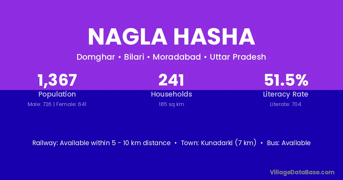 Nagla Hasha village has a total population of 1,367 people, of which 726 are males and 641 are females.