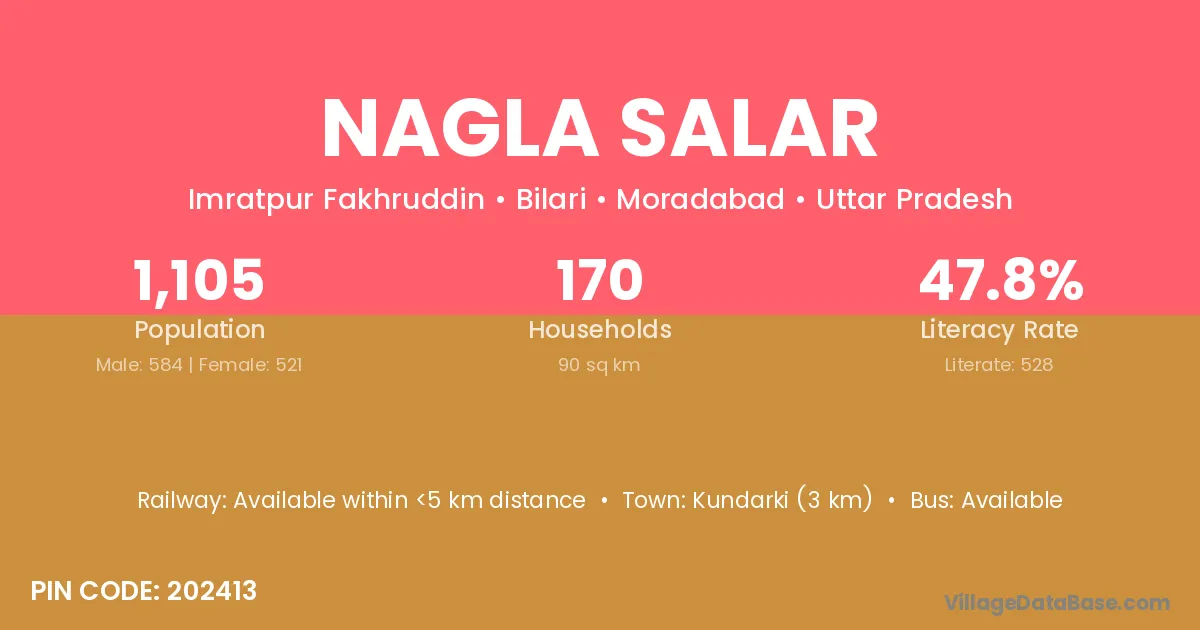 Kundarki (3 km) is the nearest town to Nagla Salar village for major economic activities and is located approximately 3 km away.