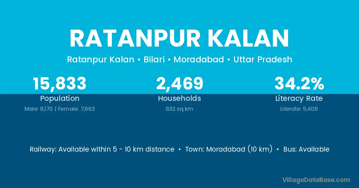 Moradabad (10 km) is the nearest town to Ratanpur Kalan village for major economic activities and is located approximately 10 km away.