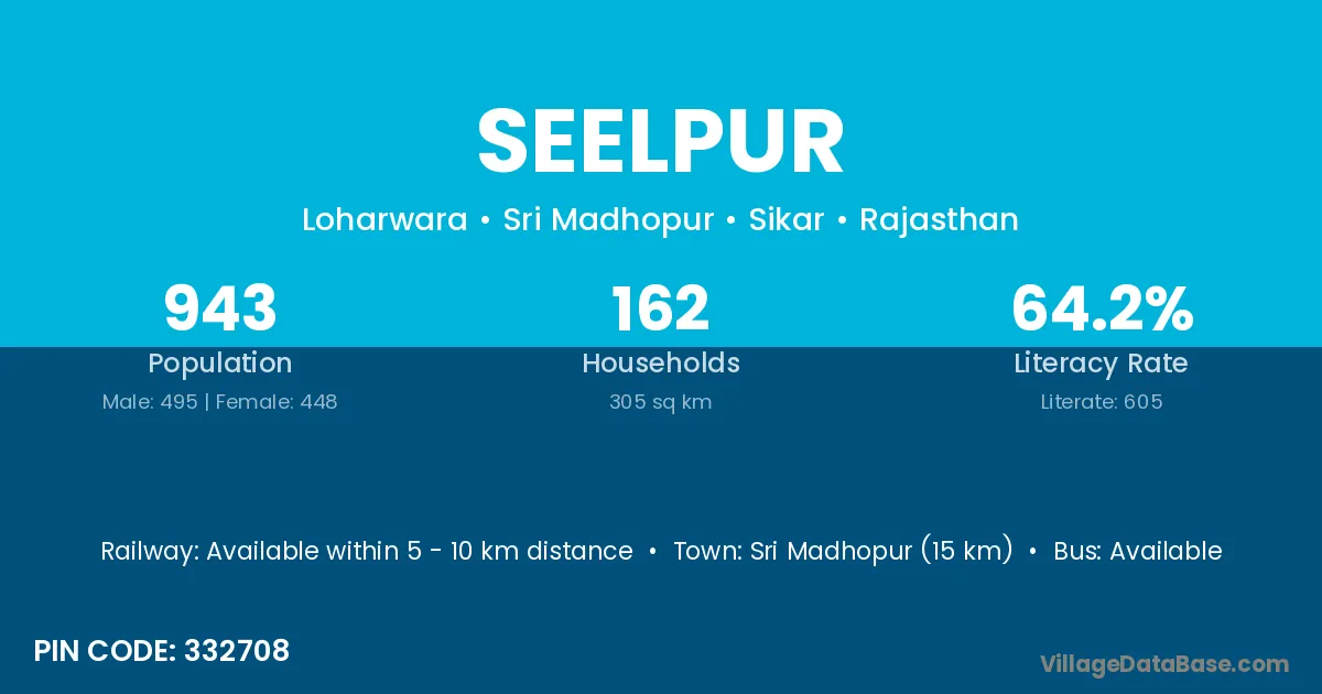 The literacy rate of Seelpur village is 38.14%. Male literacy stands at 46.60% and female literacy at 28.70%.