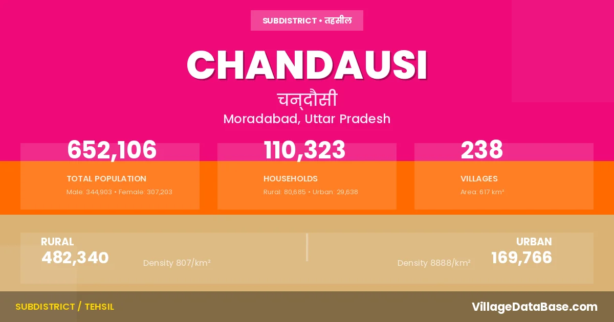 According to the 2011 census The total area of Chandausi Tehsil is 617 km², with a population of 652106 people. The population density is 1,057 inhabitants per square kilometre, and there are approximately 110323 houses in the sub district.