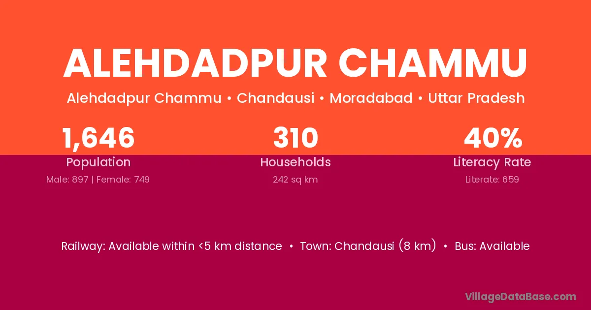 Chandausi (8 km) is the nearest town to Alehdadpur Chammu village for major economic activities and is located approximately 8 km away.