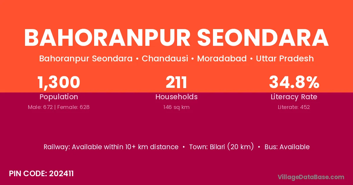 Bilari (20 km) is the nearest town to Bahoranpur Seondara village for major economic activities and is located approximately 20 km away.