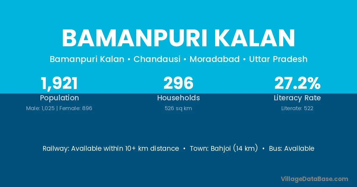 Bahjoi (14 km) is the nearest town to Bamanpuri Kalan village for major economic activities and is located approximately 14 km away.