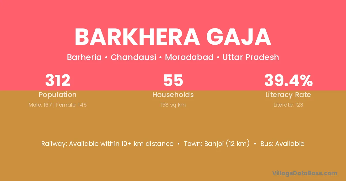 Bahjoi (12 km) is the nearest town to Barkhera Gaja village for major economic activities and is located approximately 12 km away.