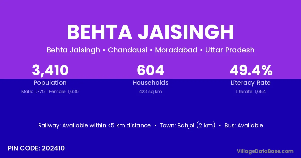 Bahjoi (2 km) is the nearest town to Behta Jaisingh village for major economic activities and is located approximately 2 km away.
