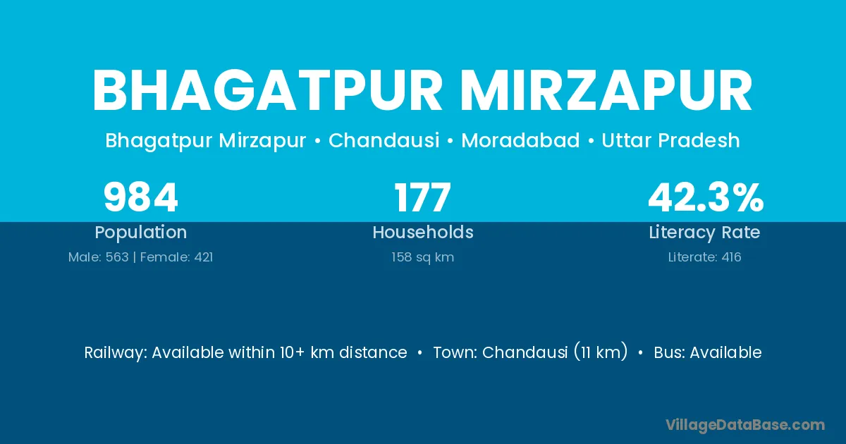 Chandausi (11 km) is the nearest town to Bhagatpur Mirzapur village for major economic activities and is located approximately 11 km away.