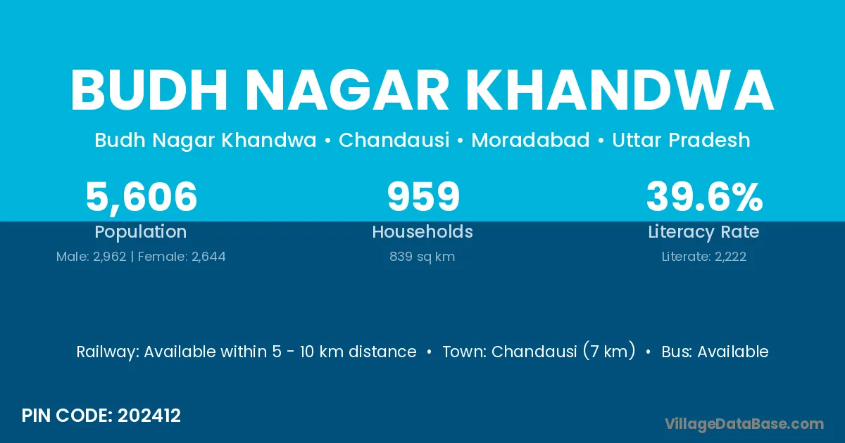 Chandausi (7 km) is the nearest town to Budh Nagar Khandwa village for major economic activities and is located approximately 7 km away.