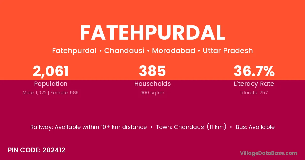 Chandausi (11 km) is the nearest town to Fatehpurdal village for major economic activities and is located approximately 11 km away.
