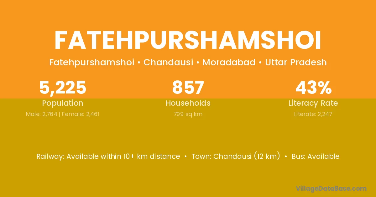 Chandausi (12 km) is the nearest town to Fatehpurshamshoi village for major economic activities and is located approximately 12 km away.