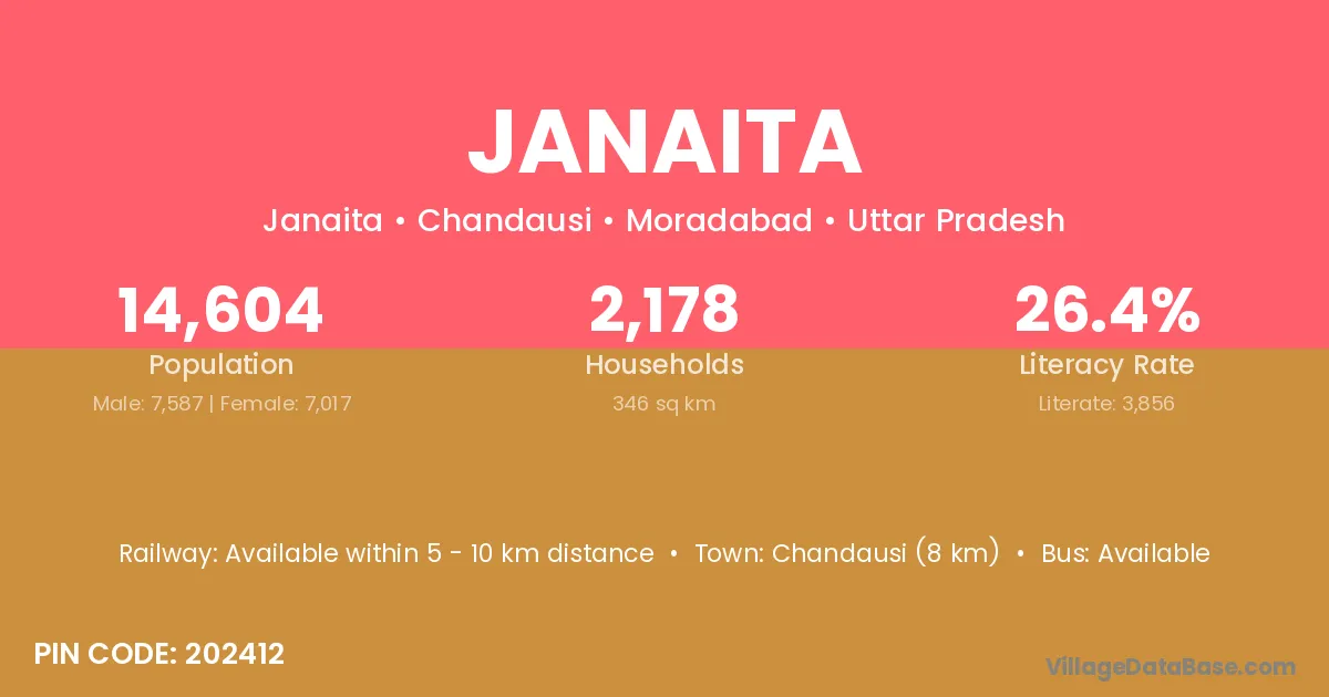 Chandausi (8 km) is the nearest town to Janaita village for major economic activities and is located approximately 8 km away.