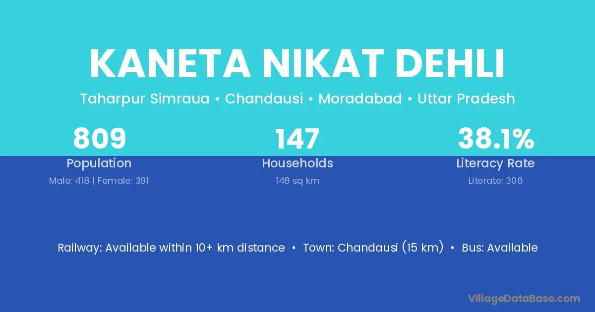 Chandausi (15 km) is the nearest town to Kaneta Nikat Dehli village for major economic activities and is located approximately 15 km away.