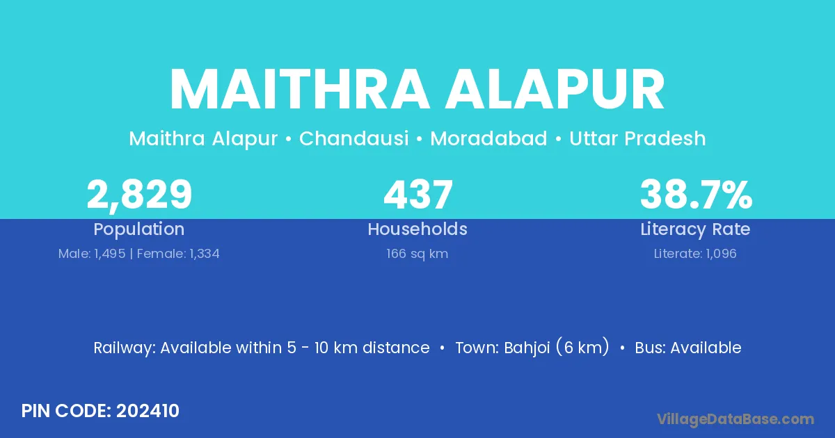 Bahjoi (6 km) is the nearest town to Maithra Alapur village for major economic activities and is located approximately 6 km away.