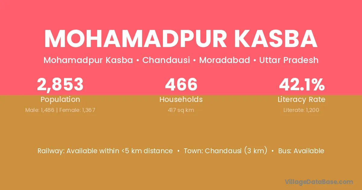 Chandausi (3 km) is the nearest town to Mohamadpur Kasba village for major economic activities and is located approximately 3 km away.