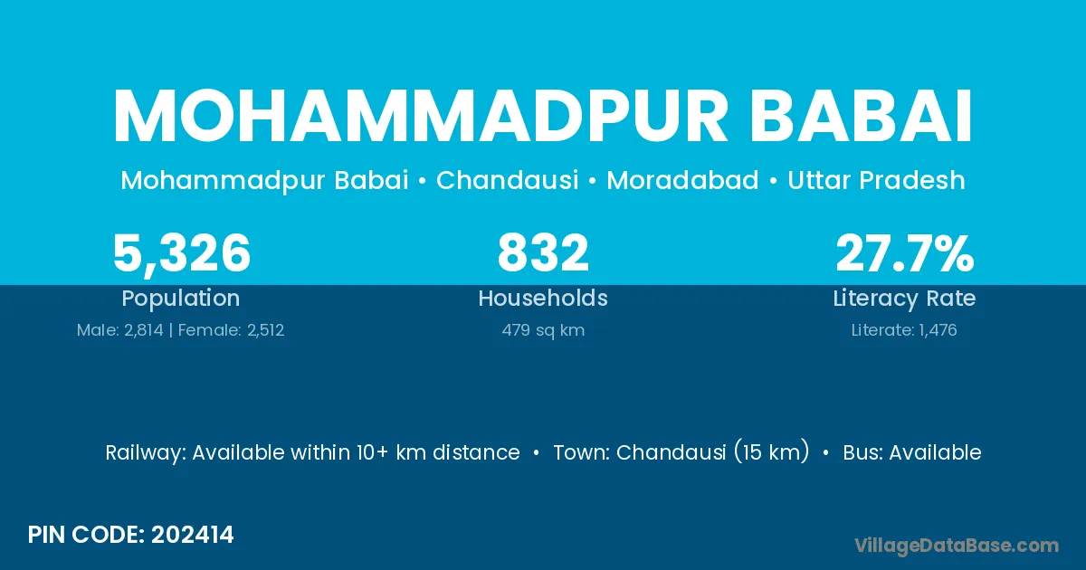 Chandausi (15 km) is the nearest town to Mohammadpur Babai village for major economic activities and is located approximately 15 km away.