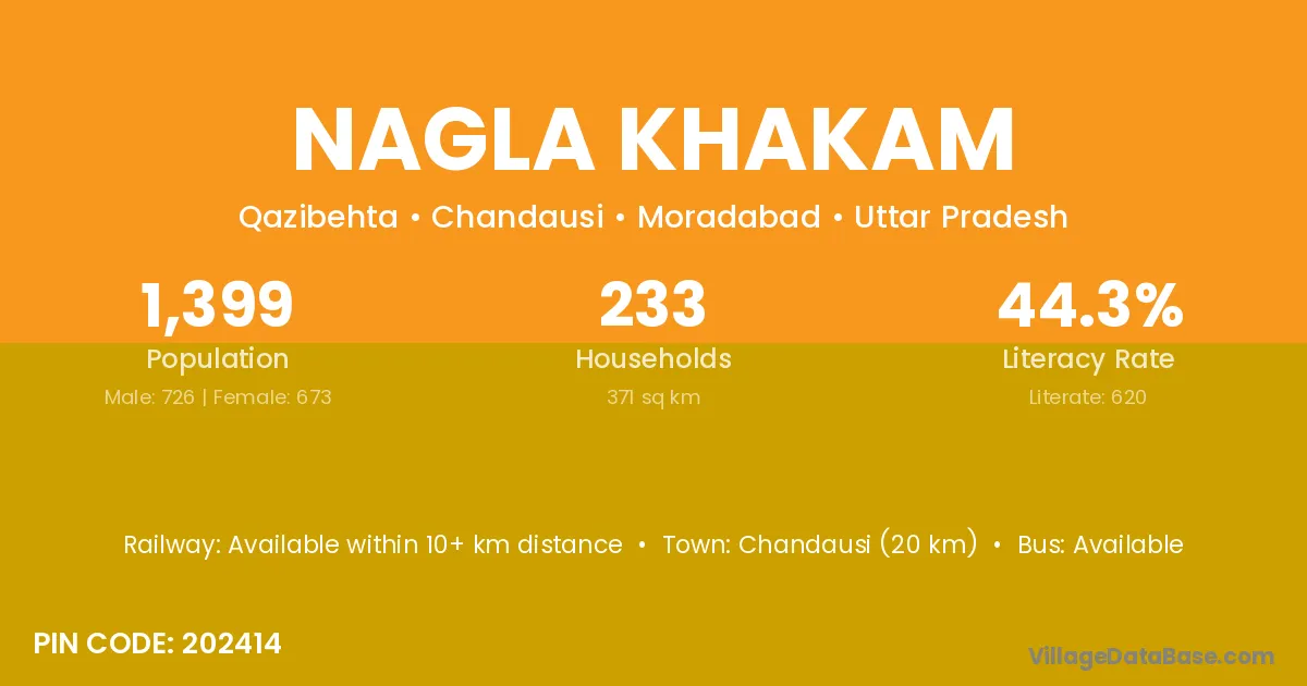 Chandausi (20 km) is the nearest town to Nagla Khakam village for major economic activities and is located approximately 20 km away.