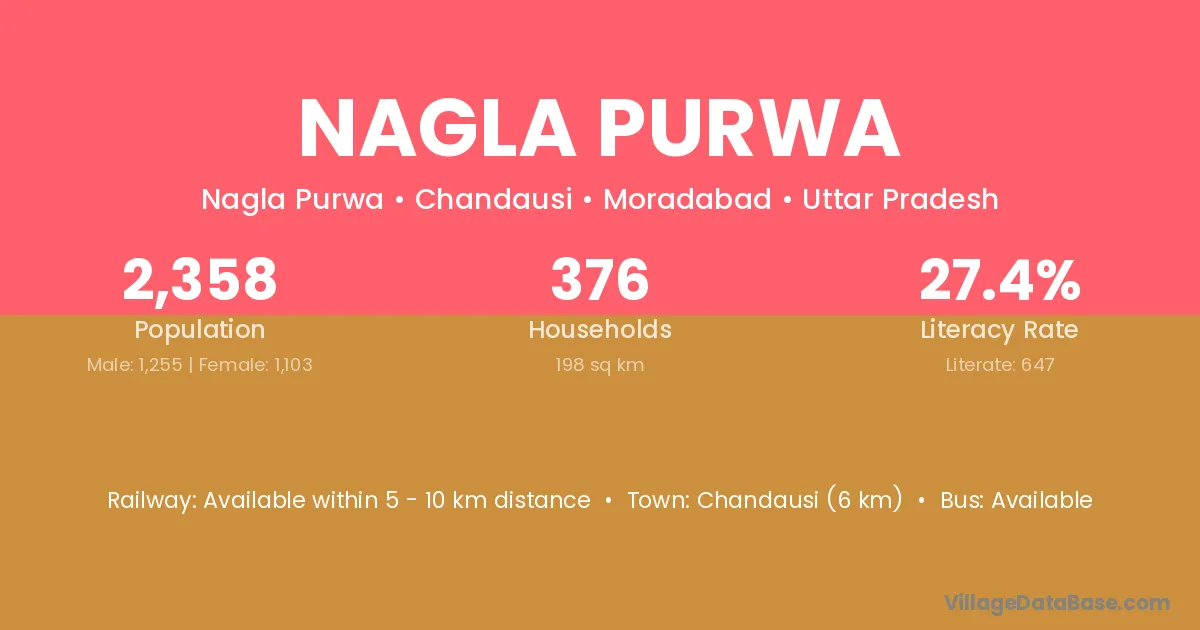Chandausi (6 km) is the nearest town to Nagla Purwa village for major economic activities and is located approximately 6 km away.