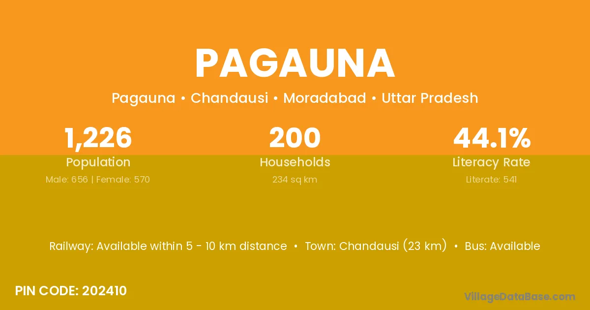 Chandausi (23 km) is the nearest town to Pagauna village for major economic activities and is located approximately 23 km away.