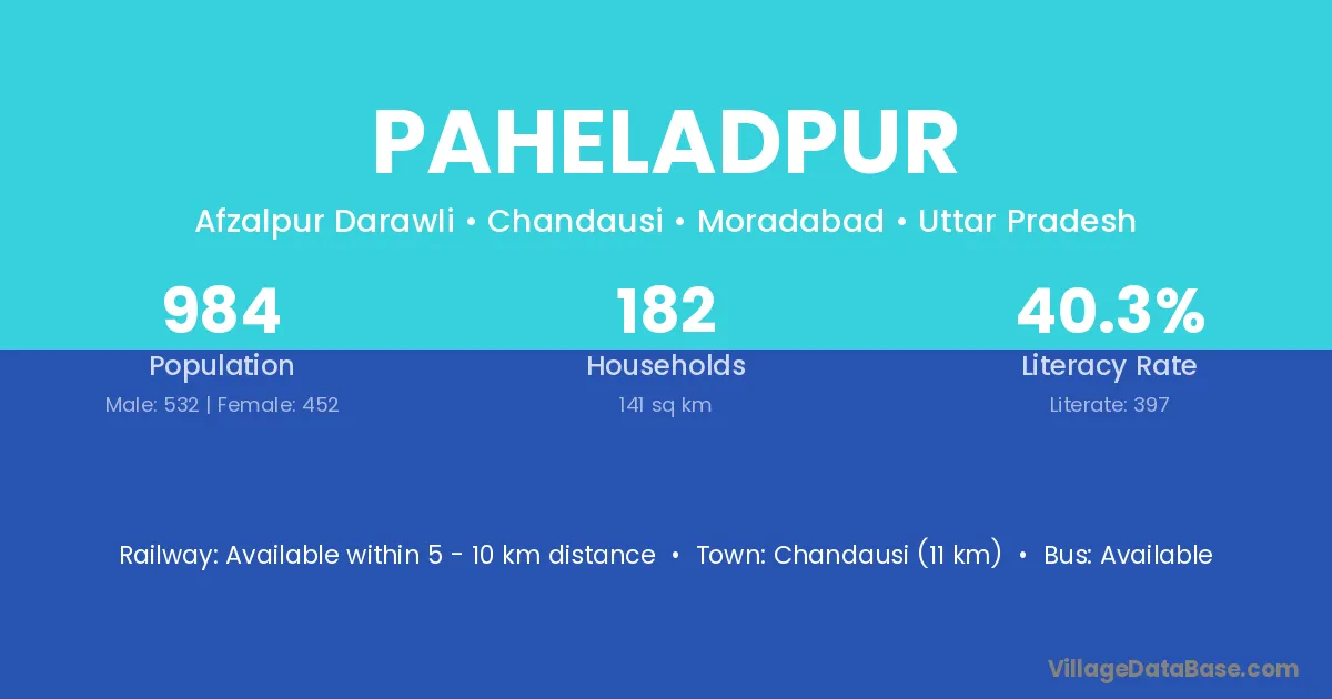 Chandausi (11 km) is the nearest town to Paheladpur village for major economic activities and is located approximately 11 km away.