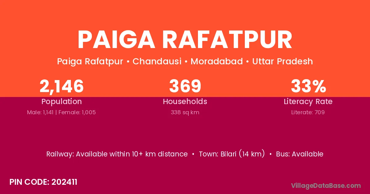 Bilari (14 km) is the nearest town to Paiga Rafatpur village for major economic activities and is located approximately 14 km away.
