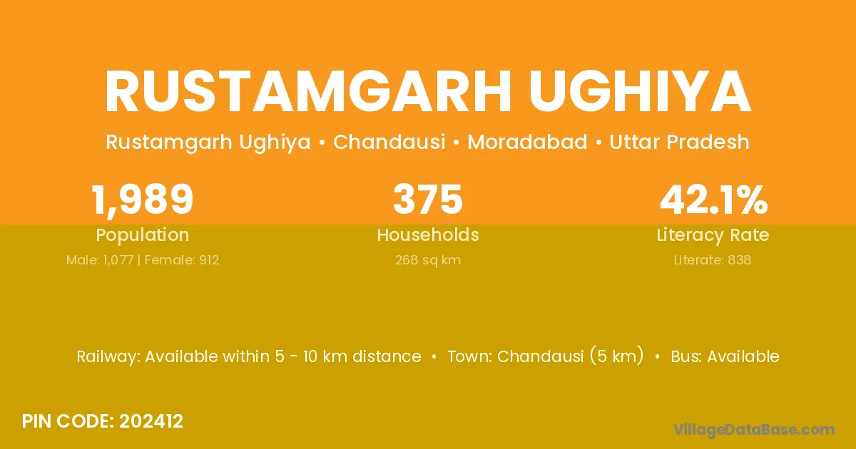 Chandausi (5 km) is the nearest town to Rustamgarh Ughiya village for major economic activities and is located approximately 5 km away.