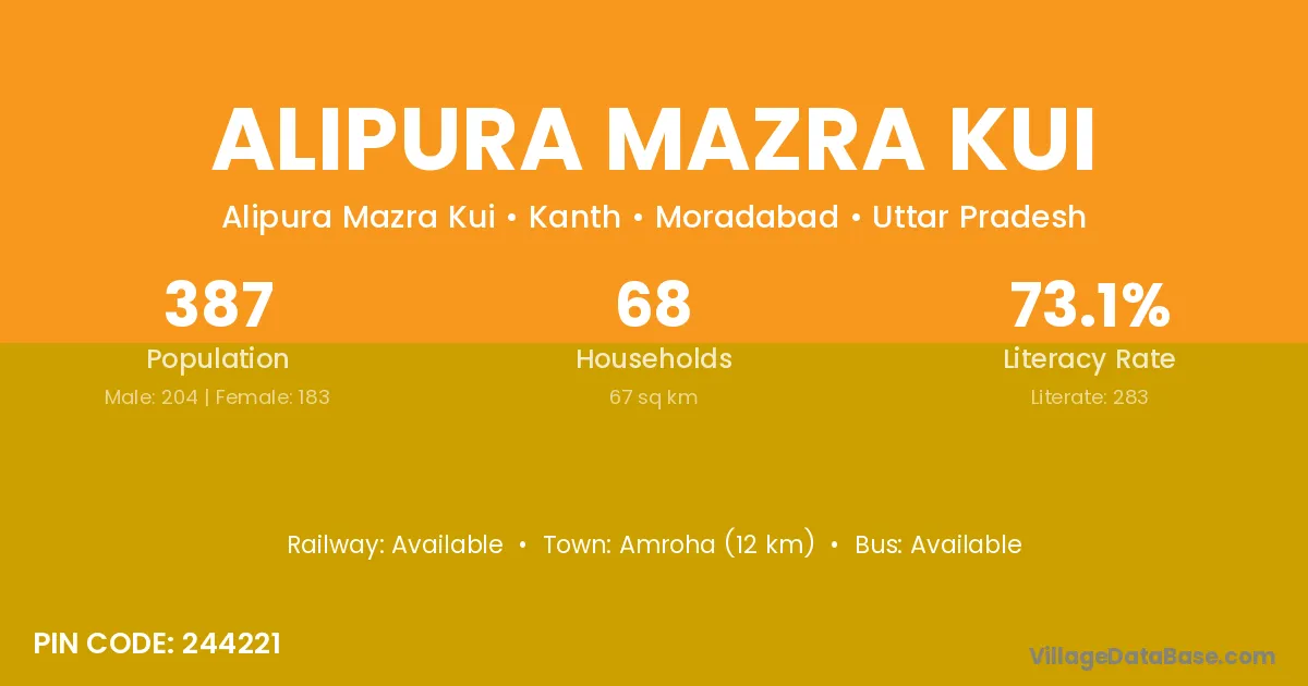 Amroha (12 km) is the nearest town to Alipura Mazra Kui village for major economic activities and is located approximately 12 km away.