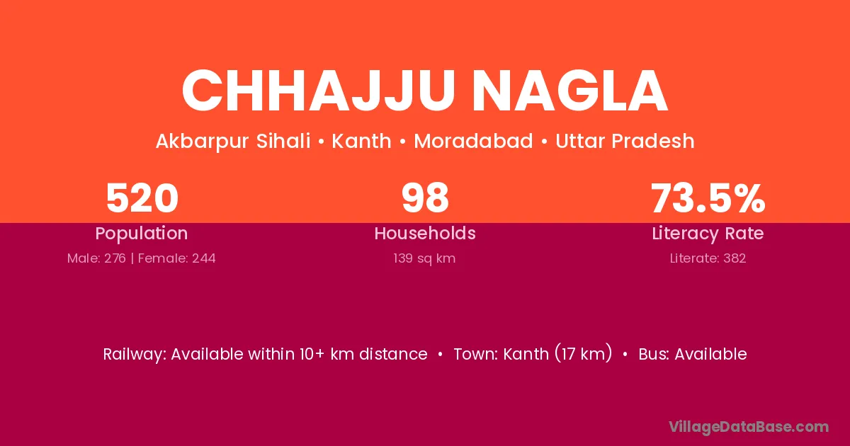 Kanth (17 km) is the nearest town to Chhajju Nagla village for major economic activities and is located approximately 17 km away.