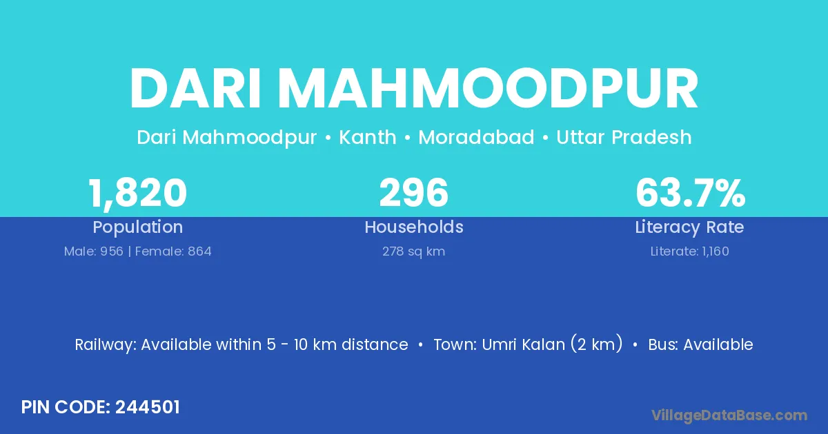 Dari Mahmoodpur village has a total population of 1,820 people, of which 956 are males and 864 are females.