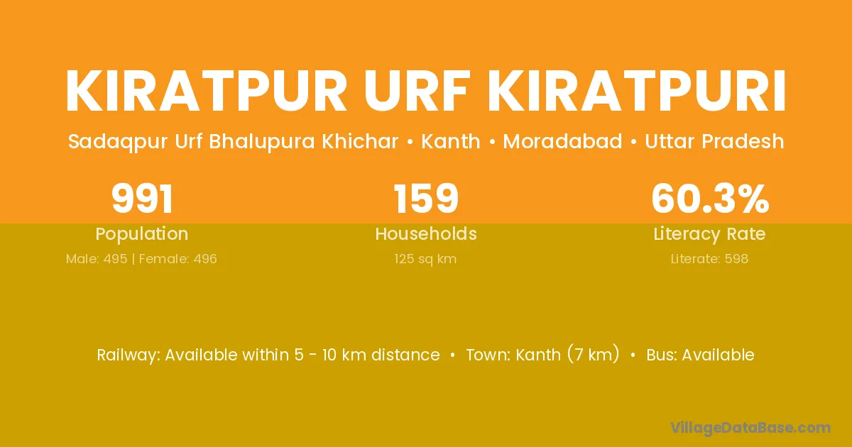 Kiratpur Urf Kiratpuri village has a total population of 991 people, of which 495 are males and 496 are females.