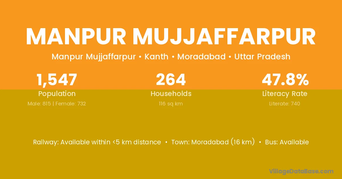 Moradabad (16 km) is the nearest town to Manpur Mujjaffarpur village for major economic activities and is located approximately 16 km away.