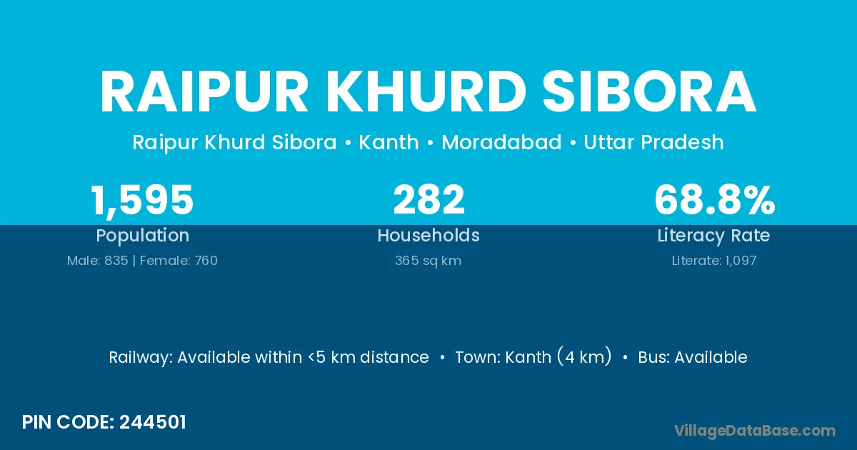 Kanth (4 km) is the nearest town to Raipur Khurd Sibora village for major economic activities and is located approximately 4 km away.