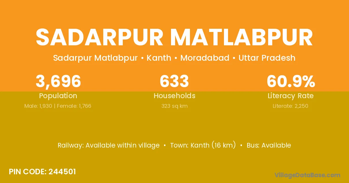 Kanth (16 km) is the nearest town to Sadarpur Matlabpur village for major economic activities and is located approximately 16 km away.