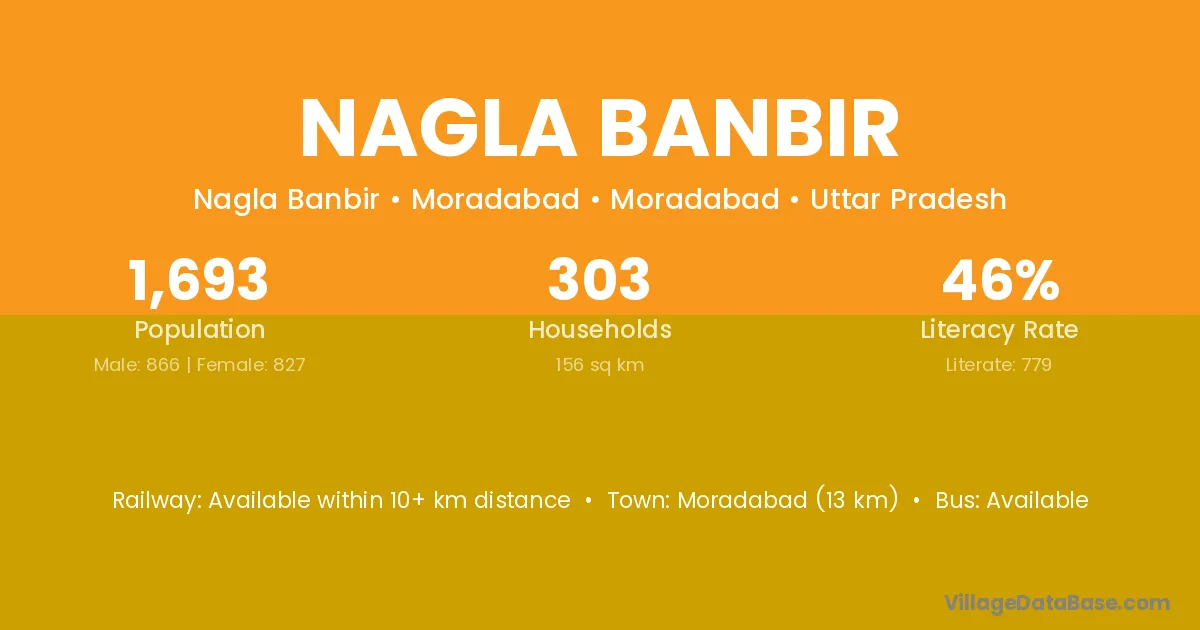 Moradabad (13 km) is the nearest town to Nagla Banbir village for major economic activities and is located approximately 13 km away.