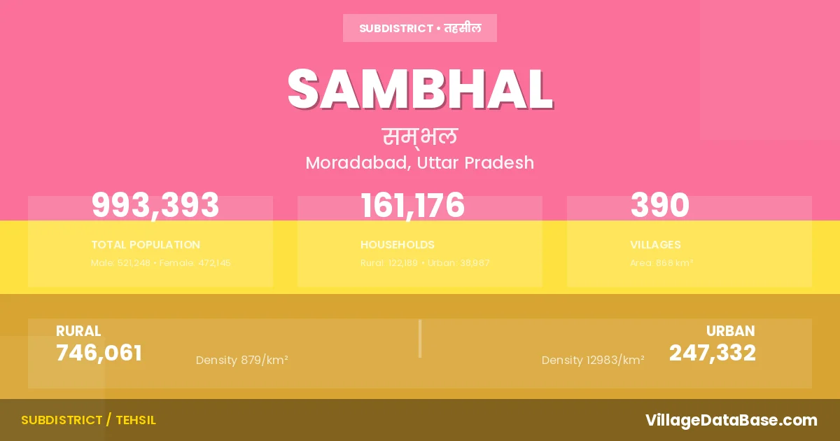 According to the 2011 census The total area of Sambhal Tehsil is 868 km², with a population of 993393 people. The population density is 1,145 inhabitants per square kilometre, and there are approximately 161176 houses in the sub district.