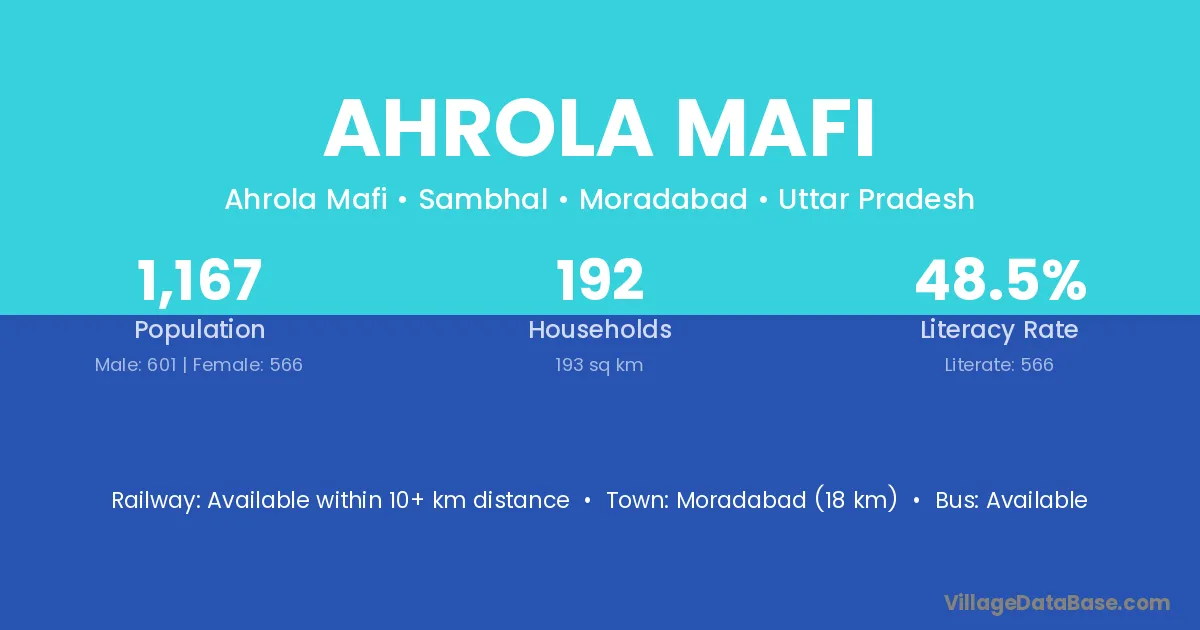 Moradabad (18 km) is the nearest town to Ahrola Mafi village for major economic activities and is located approximately 18 km away.