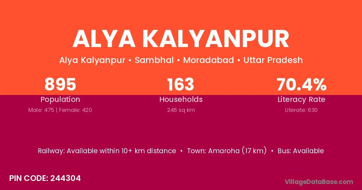 Amaroha (17 km) is the nearest town to Alya Kalyanpur village for major economic activities and is located approximately 17 km away.