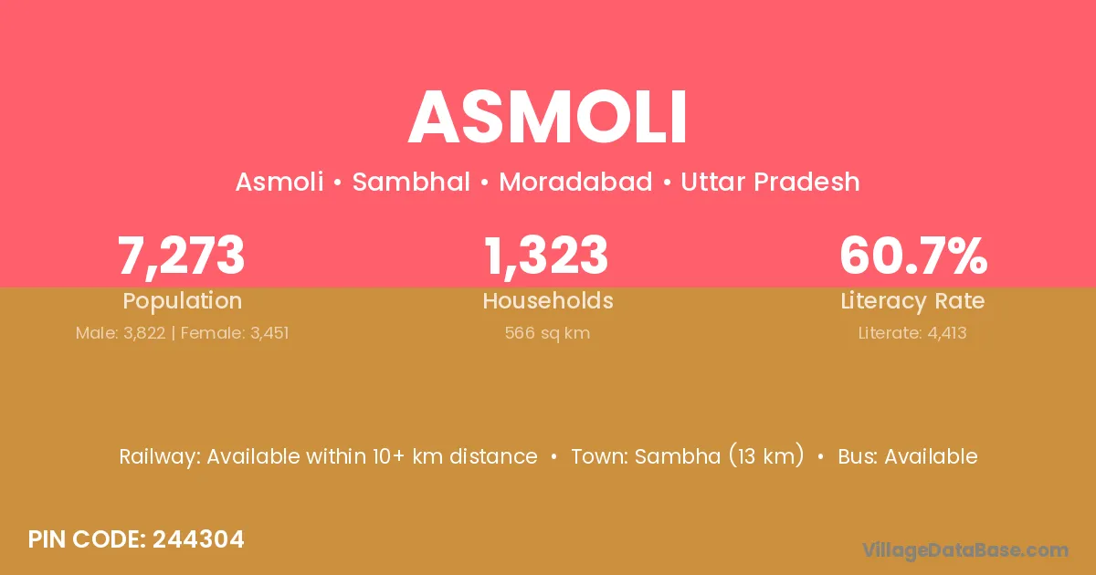 Asmoli village has a total population of 7,273 people, of which 3,822 are males and 3,451 are females.