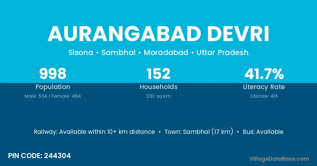 Sambhal (17 km) is the nearest town to Aurangabad Devri village for major economic activities and is located approximately 17 km away.