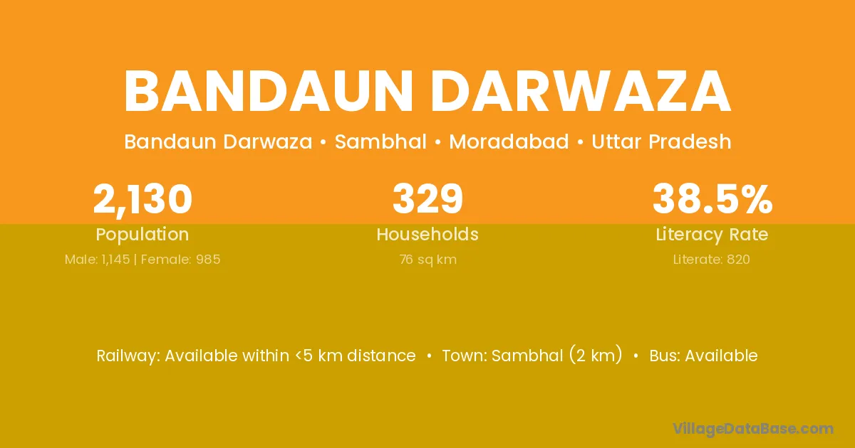 Sambhal (2 km) is the nearest town to Bandaun Darwaza village for major economic activities and is located approximately 2 km away.